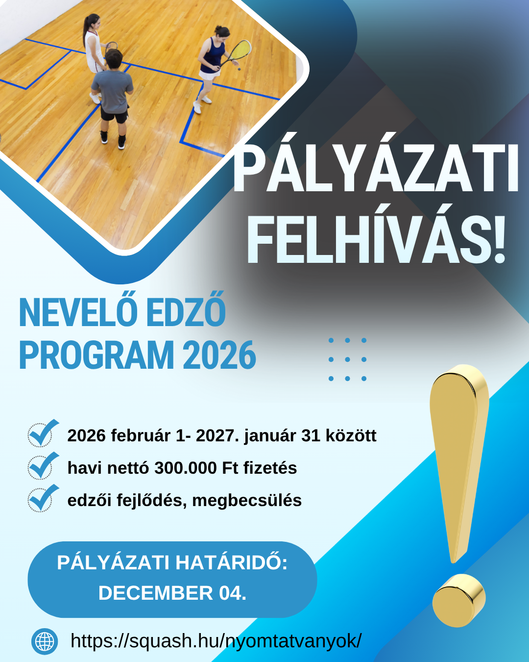 A Honvédelmi Minisztérium Sportért Felelős Államtitkársága által ismét lehetőségünk van a Nevelő Edző Programhoz (továbbiakban NEP) csatlakozni. A NEP az utánpótlással foglalkozó szakemberek szövetségi részmunkaidős foglalkoztatására ad lehetőséget 2026. február 1-től 2027. január 31-ig havi nettó 300.000 Ft munkabérrel.